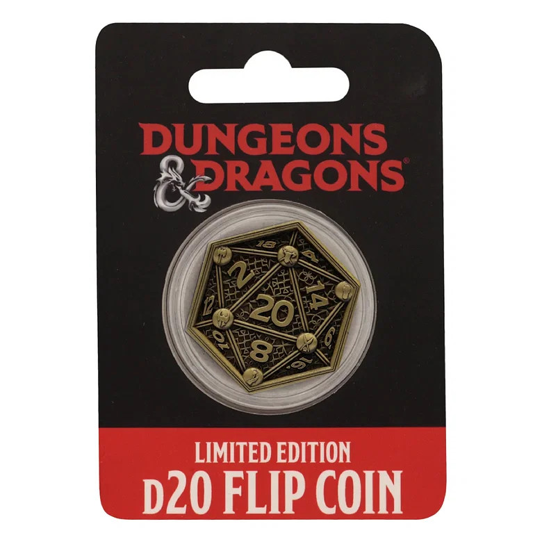 S těmito kartami o velikosti 10,5 x 14,8 cm je v balení stylová starožitná mosazná kovová házecí mince inspirovaná D20 kostkou. Tato sběratelská mince o průměru 38 mm je dodávána v ochranném akrylovém obalu.