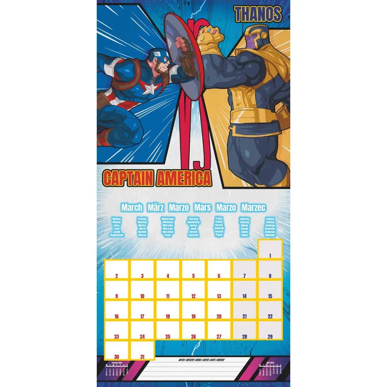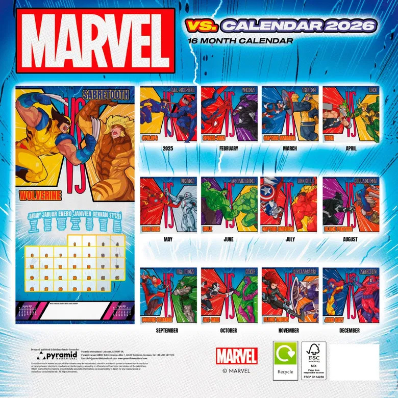 Oficiální nástěnný kalendář pro fanoušky komiksových příběhů od Marvel Comics pro rok 2026 je tady! Nenech si uniknout parádní ilustrace slavných superhrdinů a superpadouchů, jako jsou Wolverine, Cyclops, Spider-Man, Captain America, Iron Man, Hulk, Doctor Strange, Black Widow, Thanos, Sabretooth, Red Hulk, Kang a další!