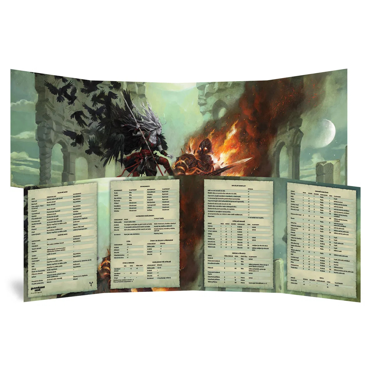 Zástěna pro vypravěče je určena pro hru na hrdiny Zapovězené země. Zvenčí se nachází ilustrace Alvara Tapia, uvnitř nalezne vypravěč užitečné herní tabulky: