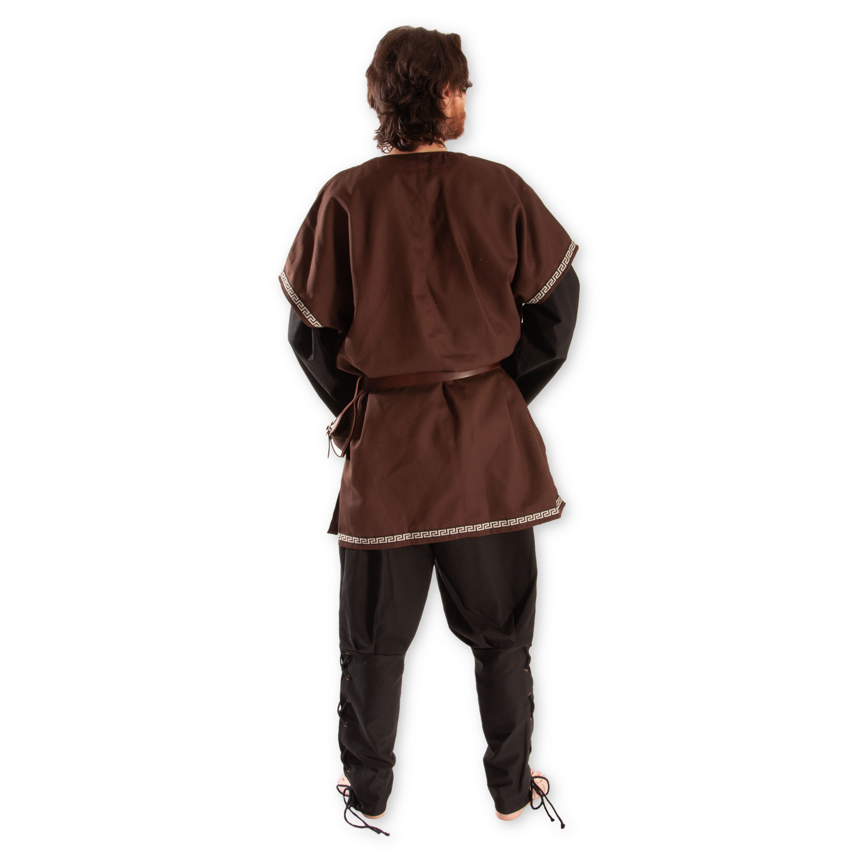 Pánská tunika Lambert bude krásným svrchním šatem ke kostýmu zámožných měšťanů s nosem i špičkami bot nahoru stočenými. Decentní zdobení a kvalitní látku ocení též šikovní kupci se suknem, kteří si na zevnějšek potrpí. Svrchní tunika s krátkými rukávy ušitá z pevného kepru, lemovaná zdobným prýmkem a šněrováním u krku. Pro větší pohodlí a volnost pohybu je tunika opatřena rozparky na bocích. V kombinaci se zúženými kalhotami, spodní tunikou s dlouhými rukávy a koženým opaskem snadno vytvoříte honosnější kostým na larp. Opasek a doplňky nejsou součástí tuniky. Více o použitém materiálu se dočtete zde: popis materiálů.